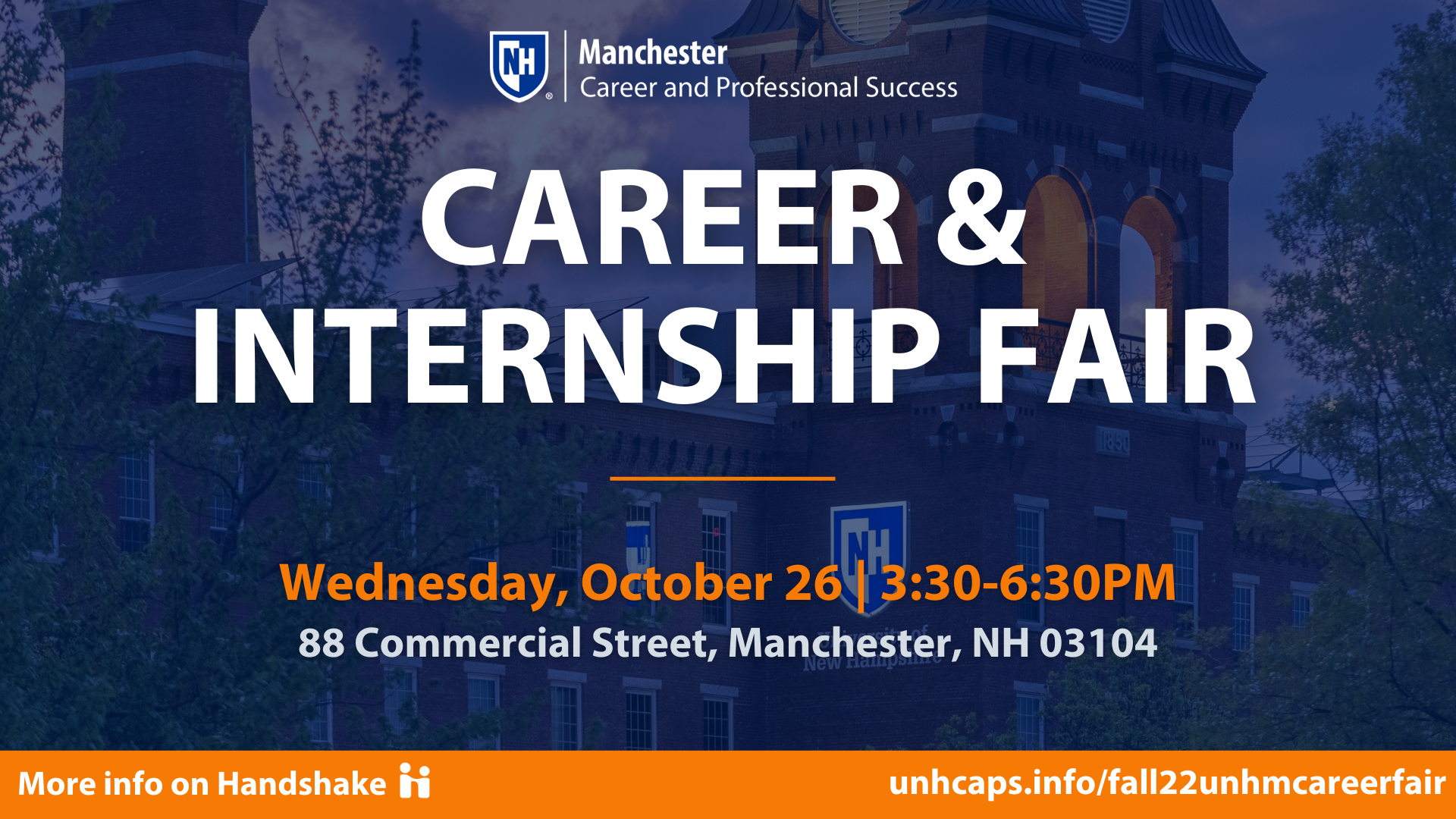 Join UNH Manchester's Career and Professional Success (CaPS) team for our Fall 2022 Career & Internship Fair! With 50+ employers from all industries and sectors, you will have the opportunity to build valuable relationships, explore potential jobs and internships, and practice your networking skills.