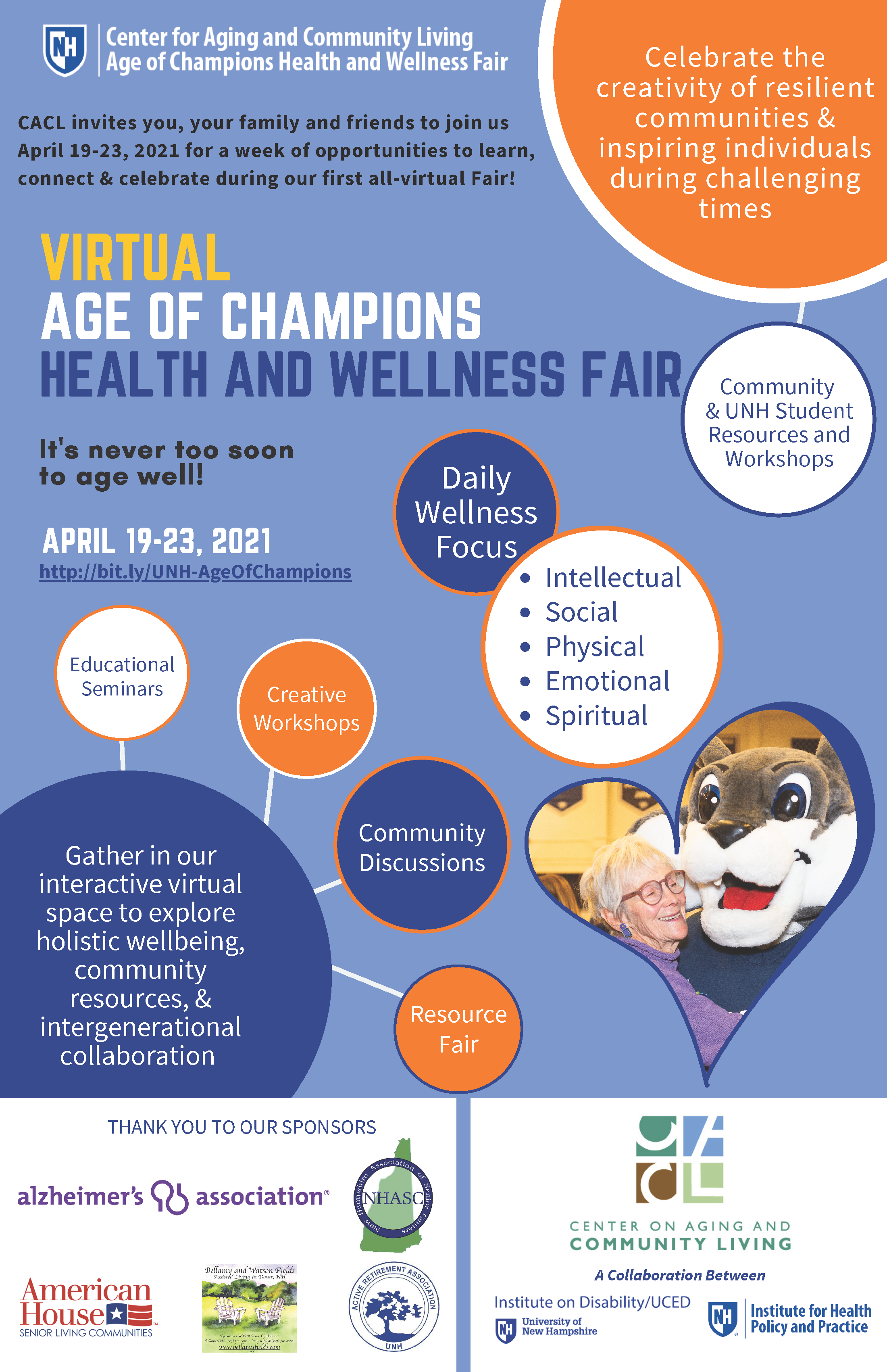 The University of New Hampshire Center on Aging and Community Living invites you, your family & friends to gather at our virtual health fair this April 19-23rd for a week of opportunities to learn, connect and celebrate aging well physically, mentally, emotionally, spiritually and socially.