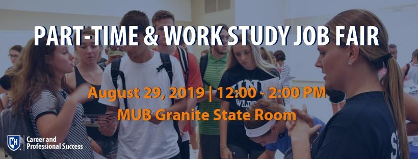 In an effort to support University of New Hampshire students looking for part-time and/or work-study jobs or internships on campus and in the community, Career and Professional Success invites all students to take part in the spring Part-Time & Work Study Job Fair on Thursday, August 29, 2019 from 12:00 – 2:00 PM in the MUB’s Granite State Room.